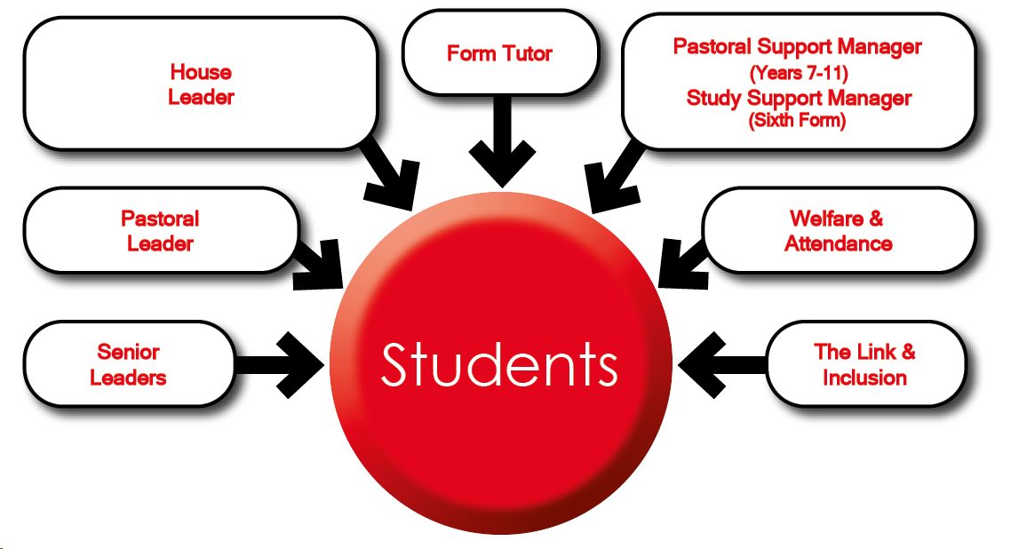 The pastoral system includes the following staff: Form Tutors; Pastoral Support Managers; House Leaders; Pastoral Leaders; Deputy Headteacher; SEND/Inclusion Co-Ordinators; Welfare Assistant; Attendance & Education Welfare Officer as well as a range of external agencies who offer individual and group support according to need.