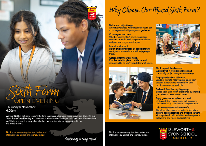 Thinking about the next step after GCSEs? Join us for our dedicated Sixth Form Open Evening on Thursday 6 November, starting at 6.00pm. This 90-minute event is designed to give prospective students and their families a real insight into life at Isleworth & Syon Sixth Form. Click the image right to view full size.
